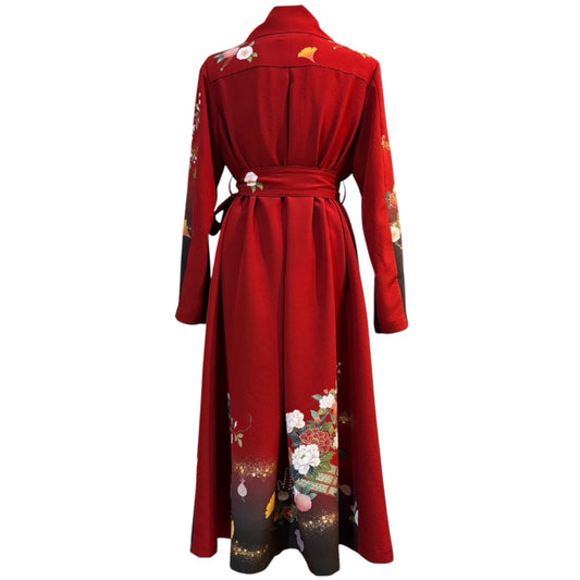 Sold out【四季花と花筏】真赤な振袖リメイクドレスコート 両前身頃裏地付き