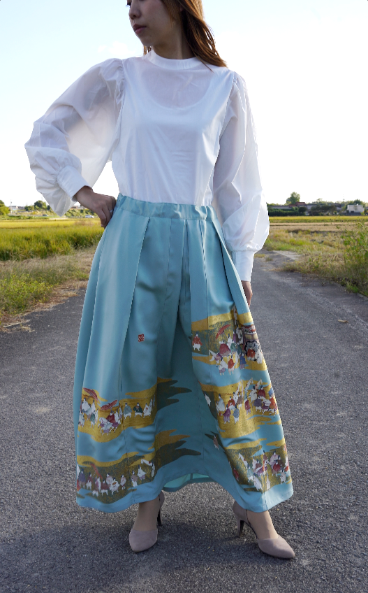 【落款有り】金彩友禅色留袖リメイクロングタックスカート ウエストゴム通し口付き